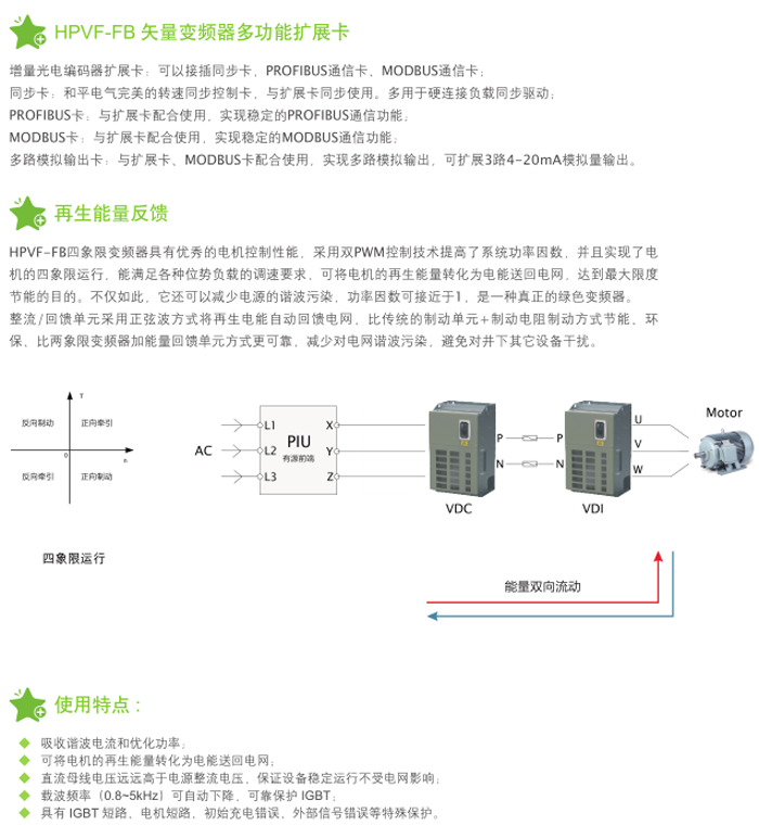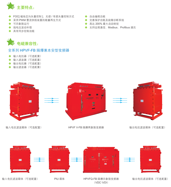 HPVF-FB隔爆兼本安型變頻器以全新的設(shè)計(jì)思路,將變頻、矢量控制、隔爆及本質(zhì)安全等技術(shù)相結(jié)合,具有多種控制模式、低速高轉(zhuǎn)矩等特性,可四象限運(yùn)行,具有能量回饋功能,節(jié)能效果明顯。主要適用于煤礦井下或露天礦山、選煤廠等有爆炸危險(xiǎn)場(chǎng)所的大負(fù)荷設(shè)備軟起動(dòng)、軟停車控制。
