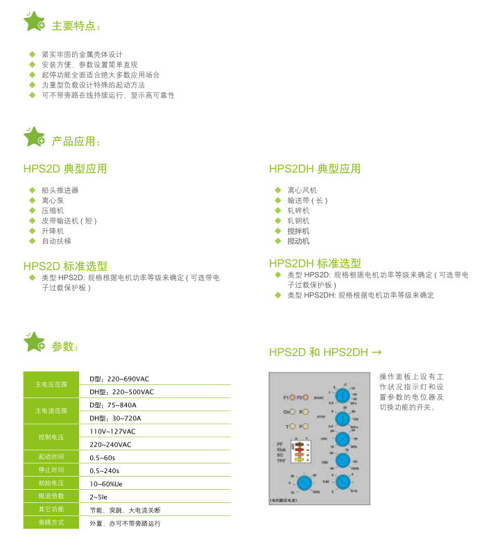 HPS2D75...840HPS2DH30...720 軟起動器均有著堅固的金屬殼體設(shè)計,可分別適用于常規(guī)負(fù)載和重型負(fù)載的各種應(yīng)用場合它結(jié)構(gòu)牢固緊湊,安裝方便快捷。所有參數(shù)和功能選項均通過前面板上的調(diào)節(jié)電位器和功能切換開關(guān)來設(shè)定和選擇。直觀清晰,各工作階段和狀態(tài)及故障均有相應(yīng)LED 指示讓用戶一目了然。特設(shè)節(jié)能功能,當(dāng)電機(jī)運(yùn)行在空載或輕載時自動降低負(fù)載電壓,